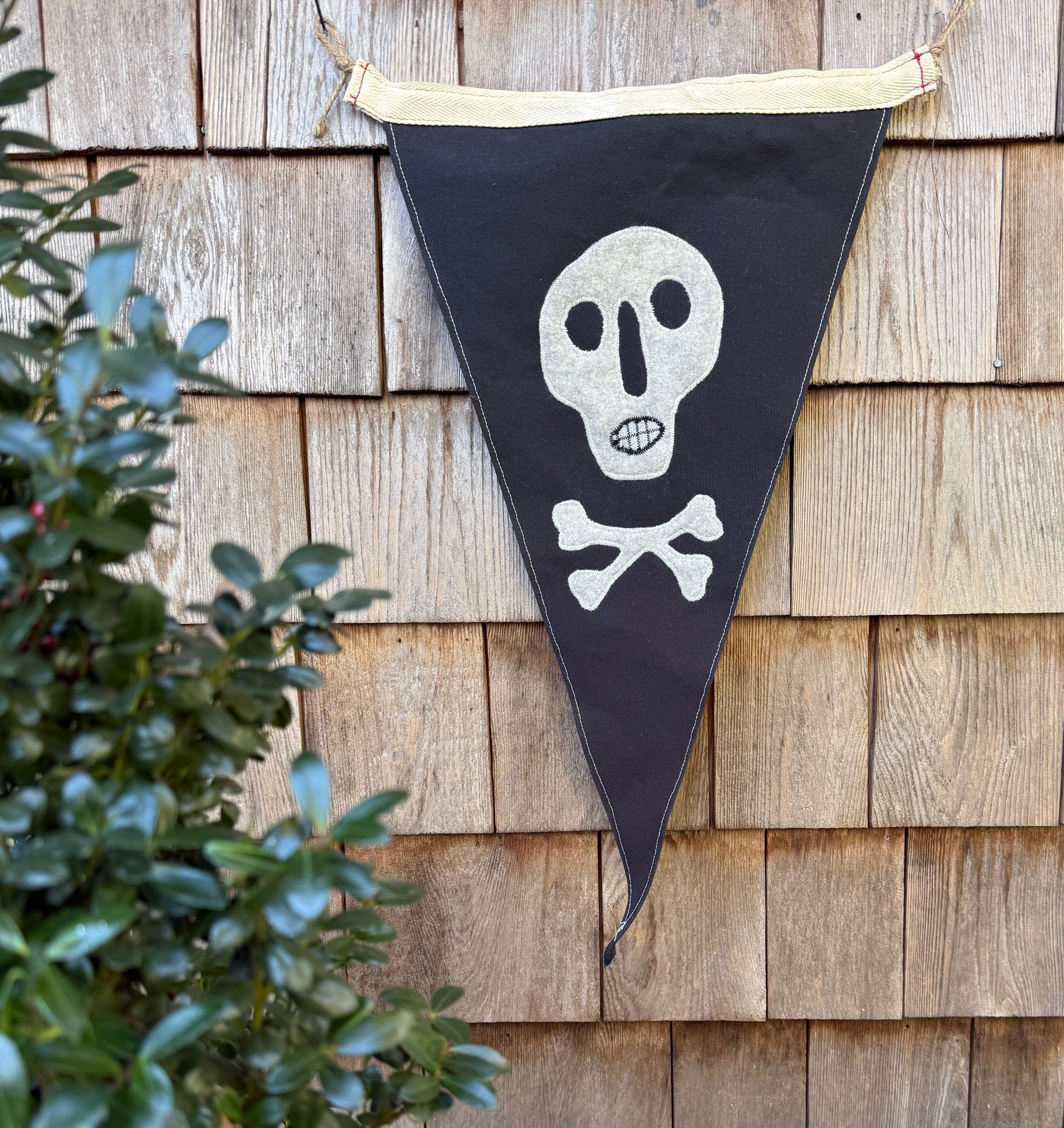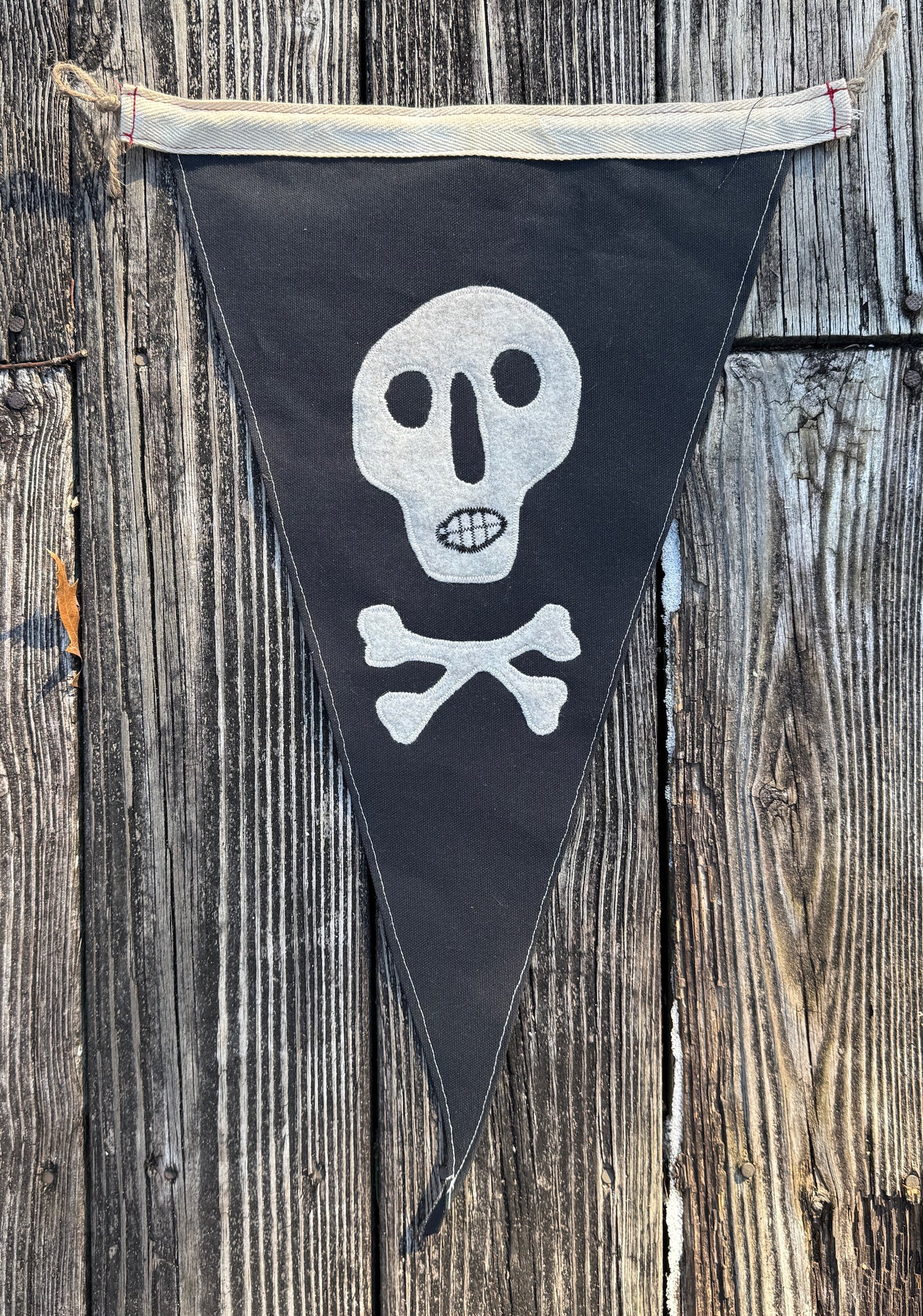- Black flag with handsewn Jolly Rodger in an oatmeal wool felt